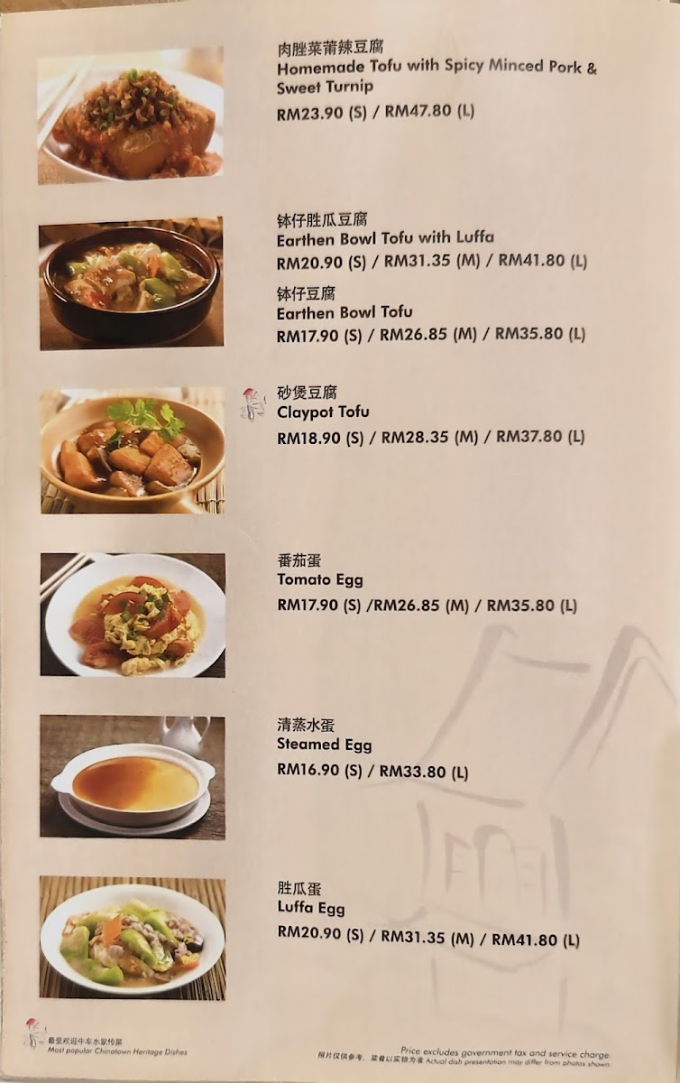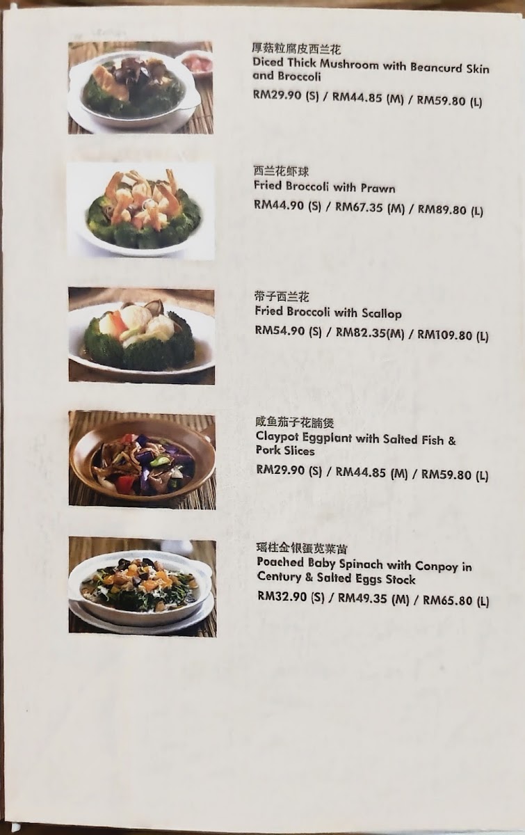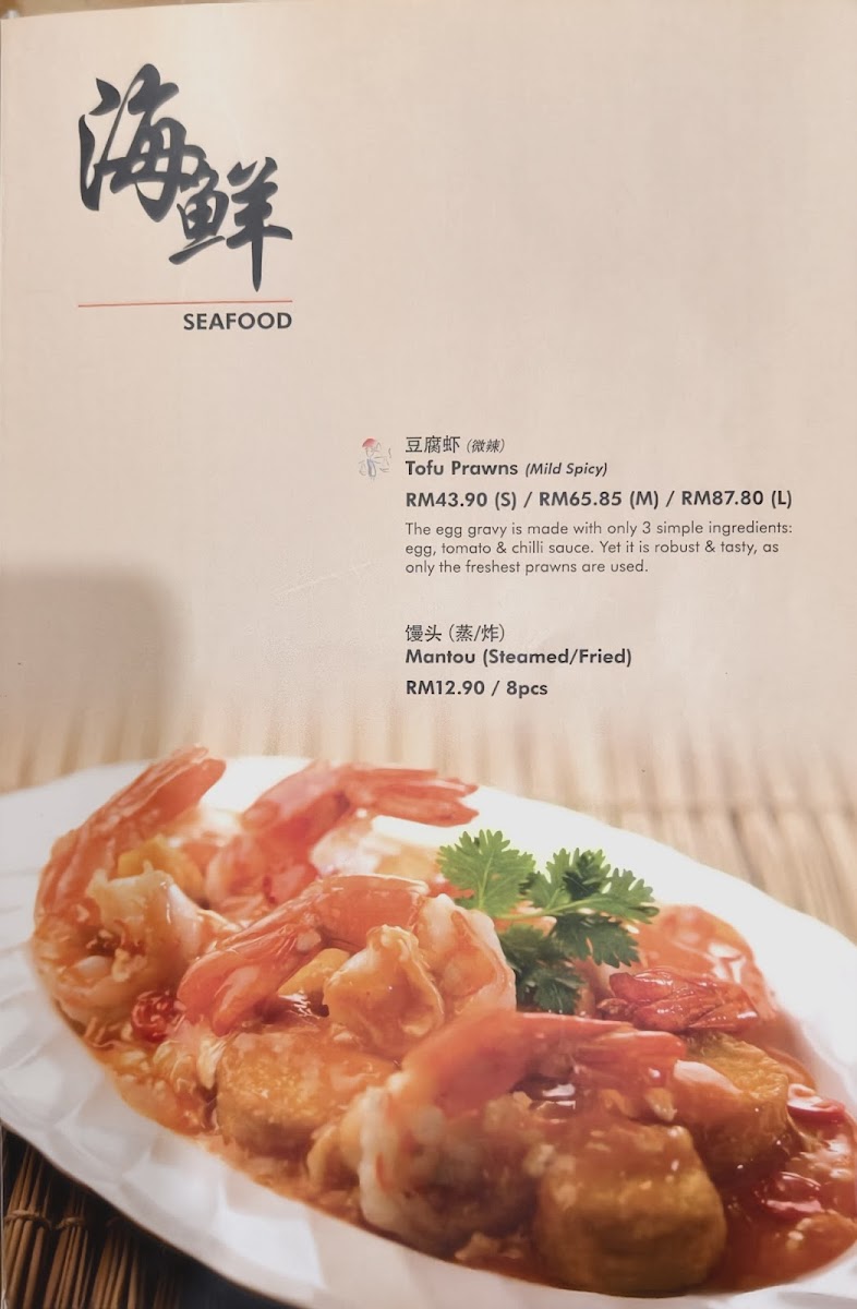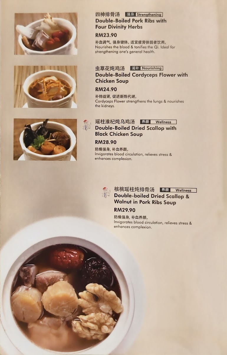 The menu at Soup Restaurant in Bandar Utama offers a comforting selection of traditional Chinese home-style dishes that emphasize simple ingredients and nourishing flavors, making it a reliable choice for family-style dining. Signature items such as Samsui Ginger Chicken stand out for their tender texture and aromatic ginger fragrance, while the Hometown Tofu and Claypot Tofu provide soft, silky bites packed with savory sauce. Vegetable dishes like Kangkung Stir Fry Bean Curd Sauce and Eggplant with Salted Fish and Sliced Pork add balance to the meal with rich yet homely flavors. Staple rice and noodle options including Steamed Rice with Chinese Sausage & Chicken, Yong Chow Fried Rice, and Penang Fried Mee Suah make the menu satisfying for those seeking hearty mains. For seafood lovers, the Hometown Fried Fish Belly, Prawns with Taufu, Steam Fish, and Seafood Crispy Noodles in Egg Sauce offer fresh and flavorful choices. Meat dishes such as Sweet N Sour Pork and Honey Spare Ribs bring a pleasant sweetness that complements the more savory items, while comforting soups like Spinach Salted Egg Drop Soup and Flower with Chicken Soup complete the meal with a warm, nourishing finish. Overall, the menu reflects a strong focus on traditional flavors, balanced nutrition, and comforting textures, making it especially suitable for group dining and those who appreciate classic Chinese home cooking.